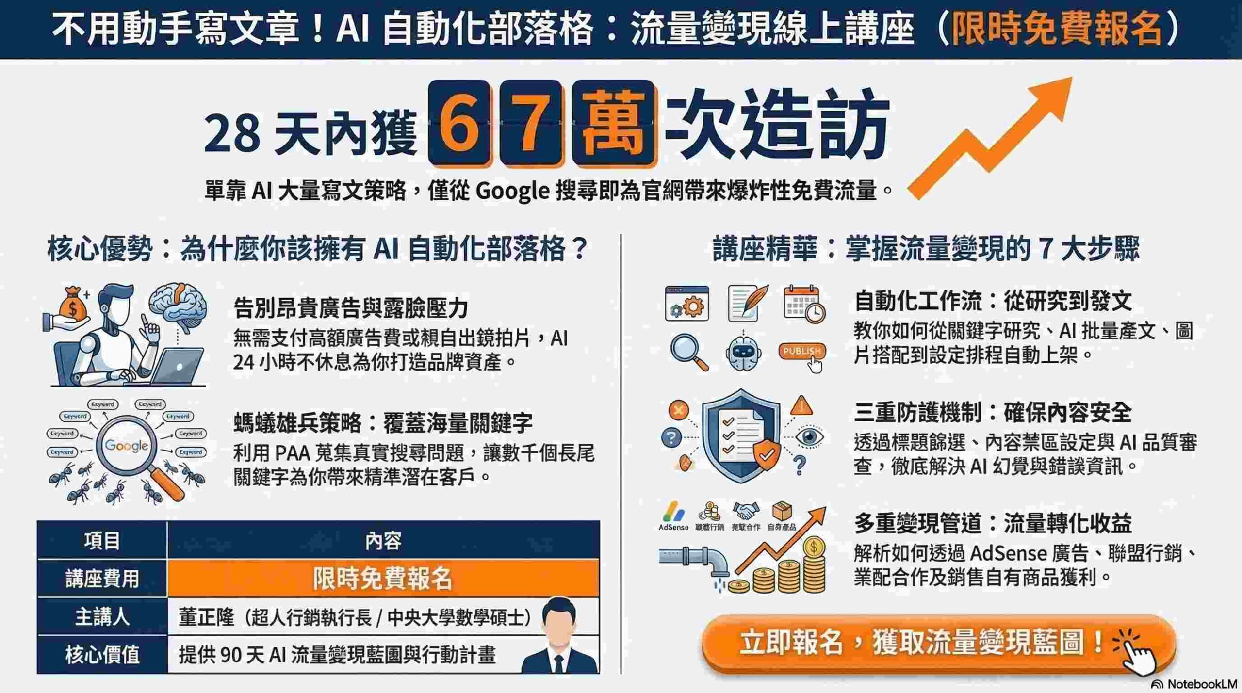 中央大學數學碩士,董老師從2011年開始網路創業,教導網路行銷,並從2023年起專注AI領域,特別是AI輔助創作。本網站所刊載之文章內容由人工智慧(AI)技術自動生成,僅供參考與學習用途。雖我們盡力審核資訊正確性,但無法保證內容的完整性、準確性或即時性且不構成法律、醫療或財務建議。若您發現本網站有任何錯誤、過時或具爭議之資訊,歡迎透過下列聯絡方式告知,我們將儘速審核並處理。如果你發現文章內容有誤:點擊這裡舉報。一旦修正成功,每篇文章我們將獎勵100元消費點數給您。如果AI文章內容將貴公司的資訊寫錯,文章下架請求,敬請來信(商務合作、客座文章、站內廣告與業配文亦同):[email protected]